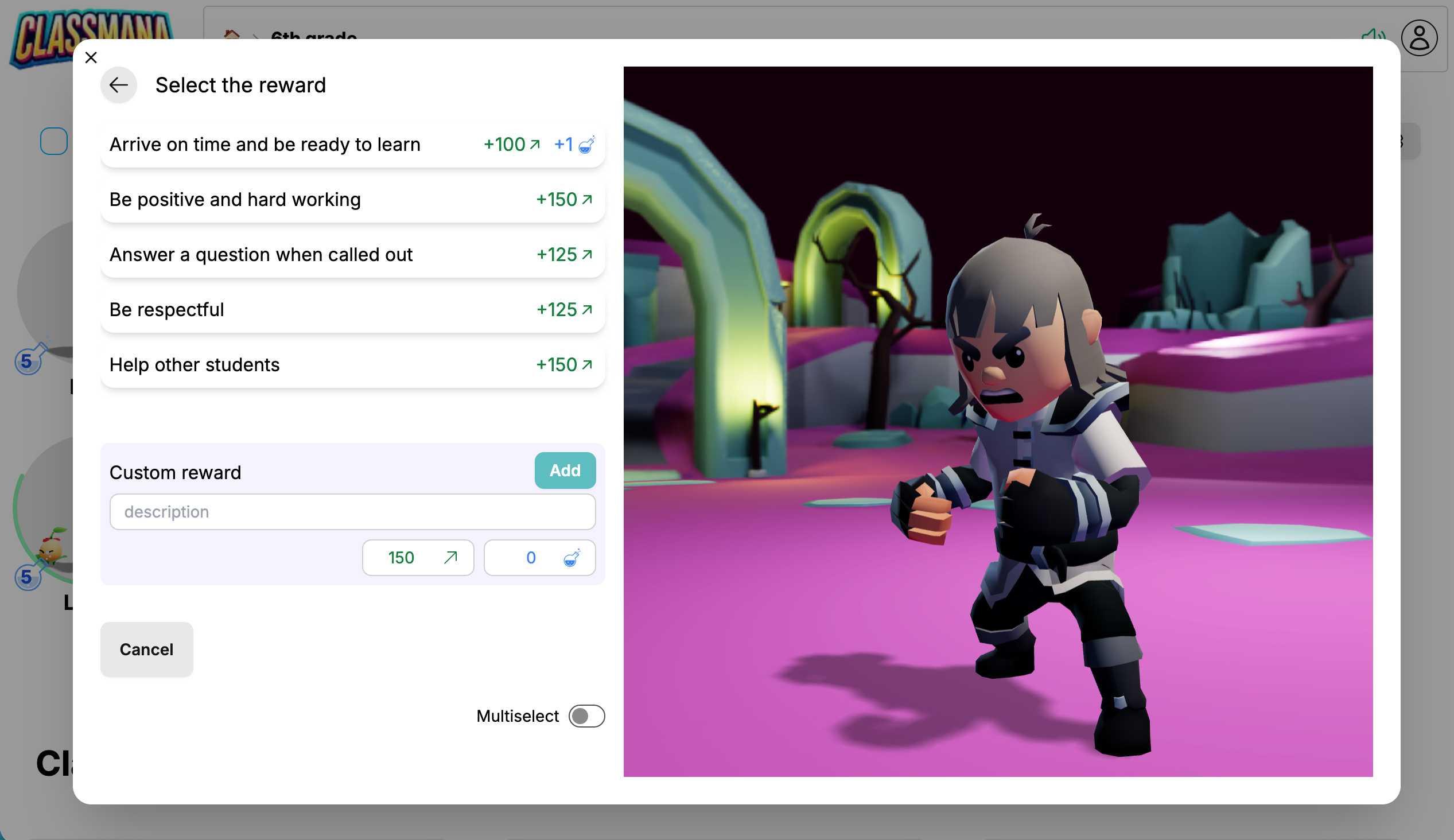 - Klikkaa "Lisää"-painiketta käyttääksesi mukautettua palkintoa oppilaalle.